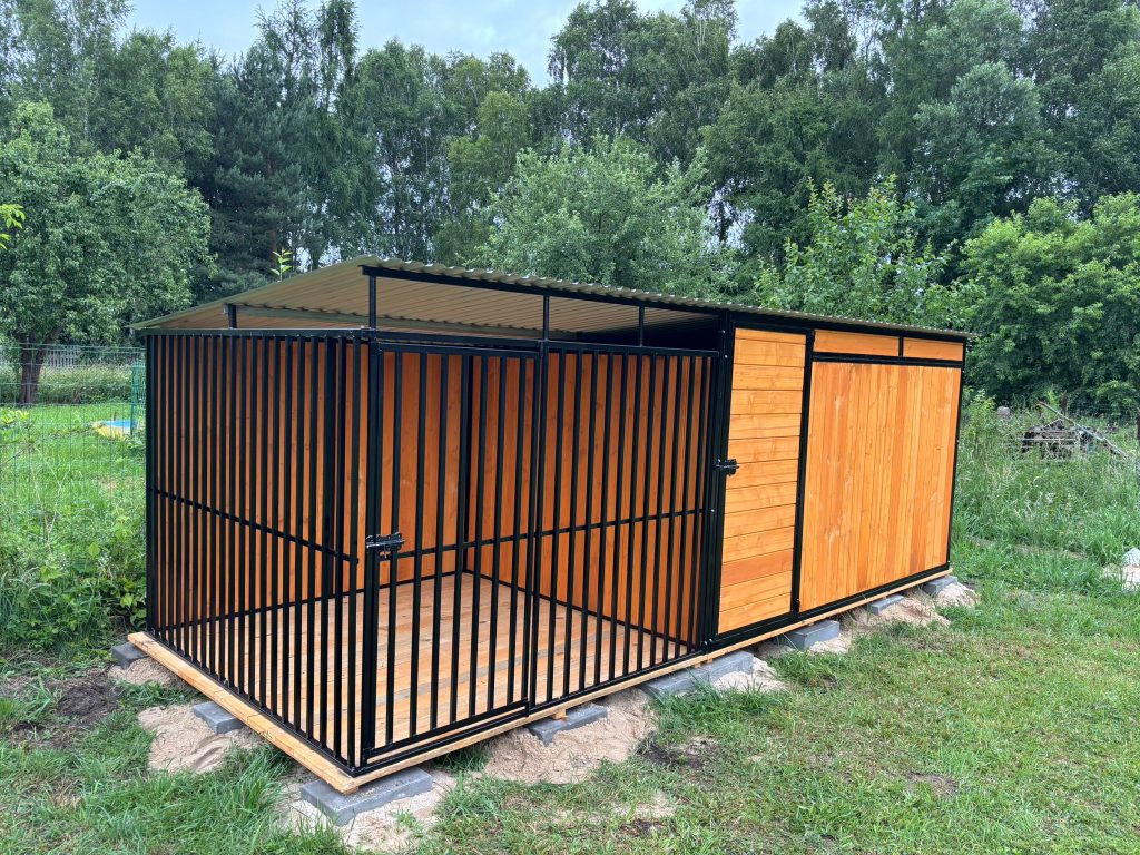 Praktyczny kojec dla psa zintegrowany z dodatkowym pomieszczeniem bocznym, tworzący jednolitą i estetyczną bryłę. To nowoczesne rozwiązanie, które łączy bezpieczeństwo i komfort psa z dodatkową przestrzenią użytkową na posesji.